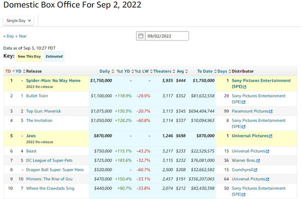 史蒂文·斯皮尔伯格执导的经典作品《大白鲨》IMAX和RealD 3D版本也于9月2日北美重映,首日票房87万美元。该片成本900万美元,1975年6月20日北美首次公映,最终收获4.72亿美元全球票房,也被认为是开创了暑期档的第一部大片。