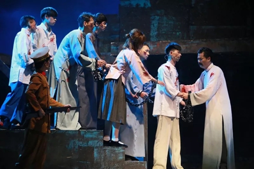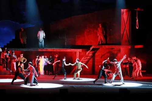 音乐剧来到了第一幕,在众人面对新奇的绞刑架众说纷纷的时候,长官宣布带上一众罪犯,一个个犯人被推搡上了刑场——正是李大钊先生和他的学生们。
